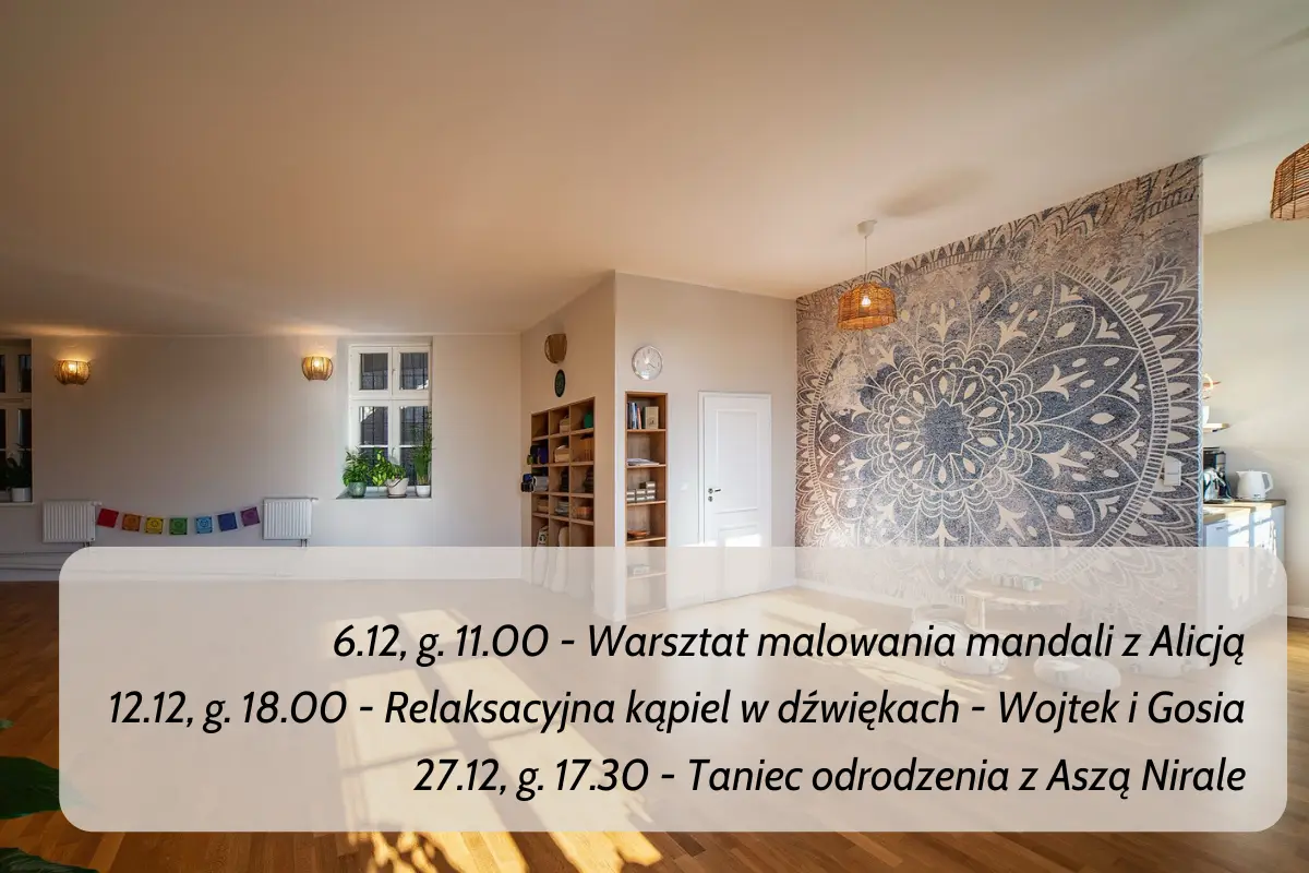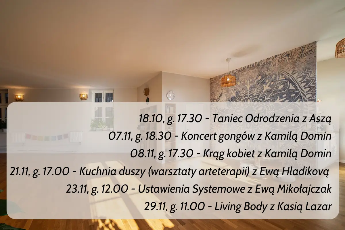 Warsztaty jednodniowe, weekendowe, koncerty relaksacyjne, to spotkania, dzięki którym zyskasz bezcenny czas dla siebie, poznasz dobrych, życzliwych ludzi, doświadczysz relaksu, odpoczynku i zadbasz o siebie.